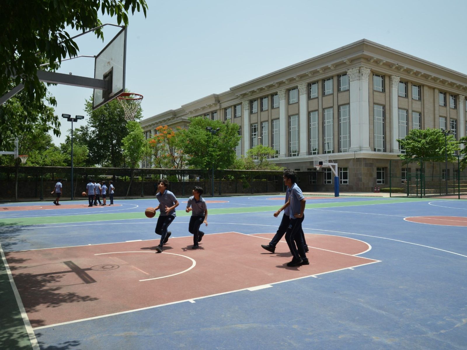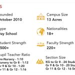 The campus has a built-up area of approximately 450,000 square feet, which includes numerous classrooms and multi-purpose halls, high-tech science laboratories, fully equipped design and technology workshops (featuring a laser cutter and a 3D printer), and a sprawling library and media centre housing over 23,000 books. The campus also features triple-height atriums with natural light, an outdoor amphitheatre accommodating up to 1,014 guests, a state-of-the-art indoor auditorium with a seating capacity of over 1,000 guests, and comprehensive facilities for visual arts, performing arts, and sports.