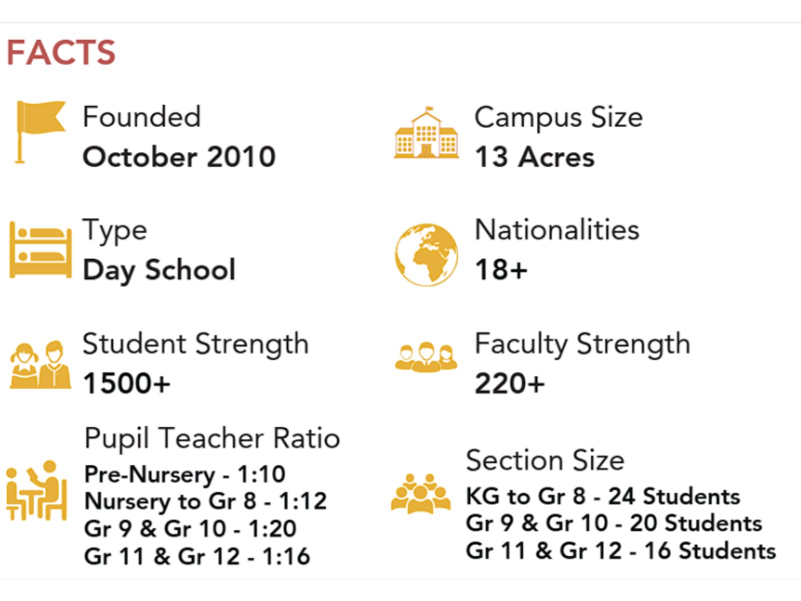 The school maintains a teacher-pupil ratio of 1:10 in Pre-Nursery, 1:12 from Nursery to Grade 8, 1:20 in Grades 9 and 10, and 1:16 in Grades 11 and 12, with section sizes capped at 24 students from Kindergarten to Grade 8, 20 students in Grades 9 and 10, and 16 students in Grades 11 and 12.